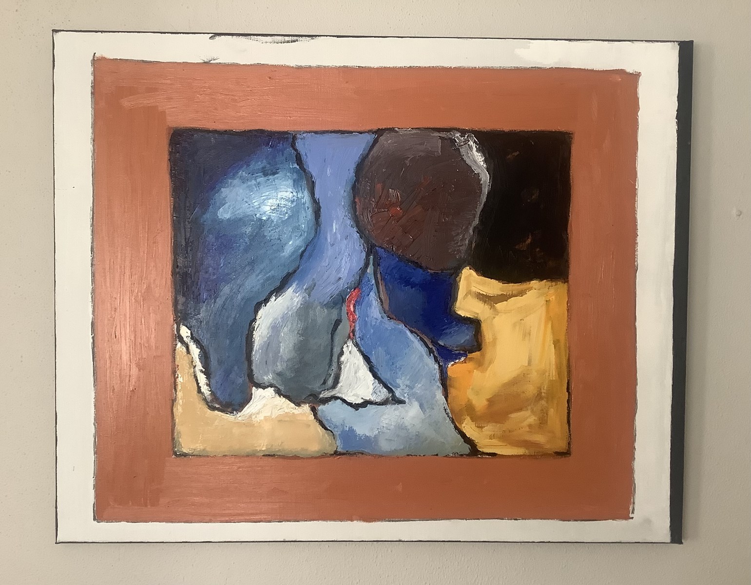 Schilderij van begin 2025 vond ik toch niet mooi. Ik heb mijn vele schetsen opnieuw bekeken en er nu een nieuw schilderij van gemaakt. Eerst met witte olieverf er over, voorzichtig aangebracht zodat de mooie stukken van het oude schilderij toch nog zichtbaar bleven. Nu is het probleem wanneer stop je. Dus eerst maar deze fase en dan verschillende keren kijken wat ik eventueel nog kan veranderen of er niets meer aan doen en zo laten.